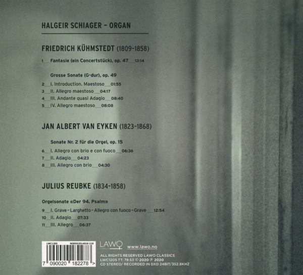 Beschreibung:Music in the 1800s, as in earlier times, was influenced by the instruments for which it was written. As far as the organ is concerned, traditionally there was the influence of the piano, but also, to an ever increasing extent, the orchestra. Beginning in the mid-1700s, the Mannheim School's introduction of variable dynamics led to a paradigm shift, and the attitudes this represented were also evident in organ music. In his book of study for the organ from 1795-98, Justin Heinrich Knecht (1752-1817) described how one could achieve a crescendo on the organ from pianissimo to fortissimo, and he indicated the specific sequence of stops to be used. Nonetheless, most organs of the time were distinguished by the ideals of the past and were not always well suited for a new registration practice. The norm, as documented in published organ music in the first decades of the nineteenth century, implied that the registration was not changed while playing, thus limiting one to terraced dynamics by the dynamics that the number of manuals permitted. This album's intention is to present examples of developments characterizing German organ music in the mid- 1800s., Runningtime: 00:00:00, Engineer [Balance Engineer], Mastered By: Thomas Wolden, Liner Notes: Halgeir Schiager, Liner Notes [English Translation]: Jim Skurdall, Liner Notes [German Translation]: Ellen Kolb-Schiager, Organ: Halgeir Schiager, Producer, Edited By: Vegard Landaas, Composed By: Friedrich Kühmstedt, Composed By: Friedrich Kühmstedt, Composed By: Jan Albert van Eijken, Composed By: Julius Reubke, Labelcode LAWO1205.2 (LWC 1205)