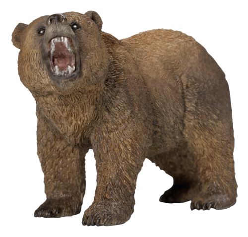 Beschreibung:Grizzlys sind große, kräftige Tiere -- sie erreichen (aufrecht stehend) eine Höhe von 2,40 Metern und ein Gewicht von 450 Kilo. Sie haben eine Art Höcker auf dem Rücken und sehr starke Hinterbeine. Grizzlybären können Geschwindigkeiten von 55 Stundenkilometern erreichen. Sie leben als Einzelgänger, und verhalten sich häufig aggressiv. Manchmal kommen sie zum Lachsfang an Gewässern zusammen. Als Allesfresser ernähren sich diese Bären von Fischen, Pflanzen und großen Säugetieren wie Elchen, Hirschen und Schwarzbären. Sie sind außerdem dafür bekannt, Nahrung von Wölfen und Menschen zu stehlen. Ab 3 Jahren.