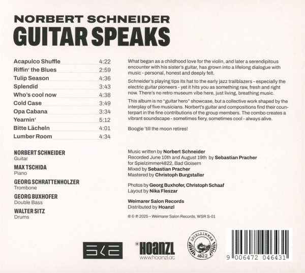 Das neue Gitarren-Instrumental-Album von Norbert Schneider. Blues, Jazz, Calypso und jede Menge Swagger. Zehn frische Instrumentals mit hochkarätiger Combo eingespielt. "Es ist wieder einmal an der Zeit die Gitarre sprechen zu lassen. Meine Liebesgeschichte mit diesem Instrument ist eine sehr intensive. Nachdem ich als Kind klassische Violine gelernt hatte, mich aber nach sieben Jahren mit dem Lehrer verwarf, dachte ich : Das wars mit der Musik. Kurze Zeit später nahm ich jedoch die Gitar...