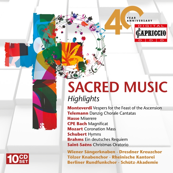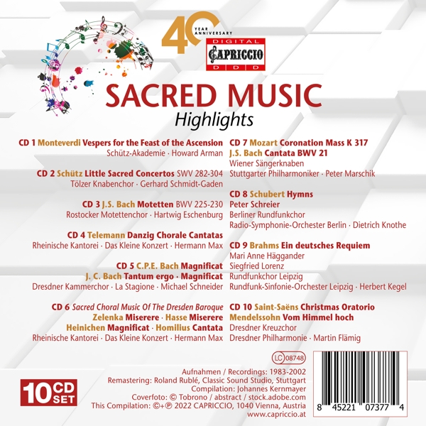 Beschreibung:Since the beginning of Capriccio's recordings the Sacred Music repertoire had a very special place in the catalogue. Started with the most famous boys' choirs in the former GDR (Dresden Boys' Choir, Thomanerchor Leipzig), continued with Boys' choirs in the West (Vienna Boys' Choir, Tölz Boys' Choir, Regensburger Domspatzen) up to artists like the Rheinische Kantorei with Hermann Max, these ensembles filled the catalogue with most interesting gaps in recording history like Zelenka, Hasse, Telemann or Carl Philipp Emanuel Bach Cantatas or Oratorios. This first Capriccio 10 album Anniversary Box includes a lot of remastered recordings from the past which have not been available at the market anymore, as well as a representative Selection of Niche- and Standard Repertoire productions., Runningtime: 00:00:00, Labelcode CIO7377.2