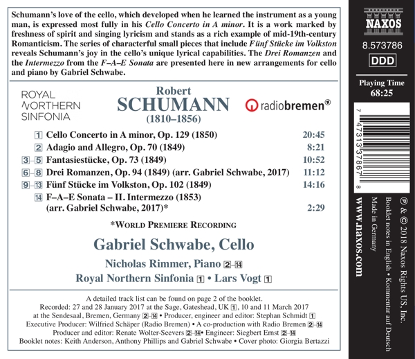 01. "Konzert für Violoncello und Orchester a-moll op. 129" 02. "Adagio und Allegro As-Dur op. 70 (für Violoncello und Klavier)" Fantasiestücke op. 73 Nr. 1-3 (für Violoncello und Klavier) 03. "Nr. 1 Zart und mit Ausdruck" 04. "Nr. 2 Lebhaft, leicht" 05. "Nr. 3 Rasch und mit Feuer" Romanzen op. 94 Nr. 1-3 (bearb. für Violoncello und Klavier von Gabriel Schwabe) 06. "Nr. 1 Nicht schnell" 07. "Nr. 2 Einfach, innig" 08. "Nr. 3 Nicht schnell" Stücke im Volkston op. 102 Nr. 1-5 (für Violoncello und Klavier) 09. "Nr. 1 Mit Humor" 10. "Nr. 2 Langsam" 11. "Nr. 3 Nicht schnell, mit viel Ton zu spielen" 12. "Nr. 4 Nicht zu rasch" 13. "Nr. 5 Stark und markiert" Sonate F.A.E. (frei aber einsam) a-moll (bearb. für Violoncello und Klavier von Gabriel Schwabe) (Auszug) 14. "2. Intermezzo"