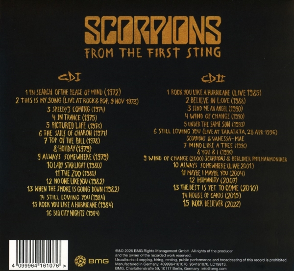 "From The First Sting" ist eine mitreißende Compilation-CD der legendären deutschen Rockband Scorpions und erscheint bei BMG Rights Mgmt GmbH. Das Album vereint einige der ikonischsten Songs aus der gefeierten Ära der Band in den 1980er Jahren ? darunter Hits wie ?Rock You Like a Hurricane?, ?Still Loving You? und ?Big City Nights?. Kraftvolle Gitarrenriffs, eindringlicher Gesang und unvergessliche Melodien zeigen eindrucksvoll auf, warum die Scorpions zu den einflussreichsten Hardrock-Bands weltweit zählen. Die Band wurde 1965 in Hannover gegründet und feierte internationale Erfolge mit über 100 Millionen verkauften Tonträgern sowie energiegeladenen Live-Auftritten und zeitlosen Hymnen. Der Hersteller BMG Rights Mgmt GmbH gilt als innovatives Musikunternehmen mit Fokus auf modernes Rechte-Management und umfassender Künstlerförderung.