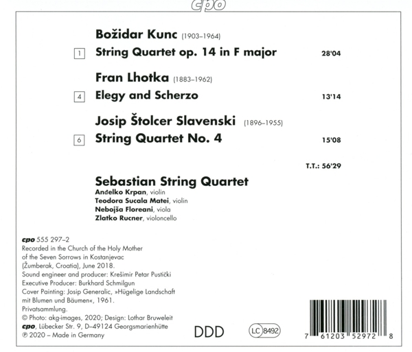 Beschreibung: | Music from the Sebastian String Quartet's native Croatia, by Croatian composers or by composers who spent a significant part of their careers in Croatia, forms a special focus in this ensemble's work. Bozidar Kunc was one of the most distinguished Croatian composers of the twentieth century as well as an extraordinary pianist who was known as "the Croatian poet of the piano." His only String Quartet very freely treats tonality, expands it's space through the linking of various instrumental parts, and often uses them as a colorful backdrop for melodies full of imaginative aspiration in which traces of folkloristic idiom sometimes come into view. Kunc's deftly articulated and richly colored string sound reveals a composer of a unique individuality. The Czech composer Fran Lhotka exercised a strong influence on the Croatian music scene for more than fifty years. He brought the best Czech traditions to Croatia and fit so perfectly into the environment of his new home that it hardly would be possible to discuss the national musical movement that arose in Croatia during the first half of the twentieth century without mentioning his name. Lhotka's captivating Elegy and Scherzo proves to be a fascinating work with contrasting themes invented in the spirit of folk music. Josip Stolcer Slavenski compiled one of the most interesting and most unusual life's works that Croatian music of the twentieth century has to offer. This enthusiastic innovator was interested in a great many things and open to the most recent musical events in Europe even though he was absorbed in his own world. He composed powerful and unconventional works without direct models or formal and stylistic determinants. In 1938 he wrote his fourth and last Quartet to Balkan dance music and with highly varied and finely crafted themes., Runningtime: 00:00:00, Composed By: Bo?idar Kunc, Composed By: Fran Lhotka, Composed By: Josip Slavenski, Design: Lothar Bruweleit, Engineer, Producer: Kre?imir Pusti?ki, Ensemble: Guda?ki Kvartet Sebastian, Executive-Producer: Burkhard Schmilgun, Liner Notes [Croatian]: Gordana Krpan, Liner Notes [English Translation]: Petra Mati?, Liner Notes [German Translation]: Eckhardt Van Den Hoogen, Painting [Cover]: Josip Generali?, Photography By: Domagoj Ugrin, Viola: Neboj?a Floreani, Violin: An?elko Krpan, Violin: Teodora Sucala Matei, Violoncello: Zlatko Rucner, Labelcode CPO555297.2 (555 297-2), Record Company Classic Produktion Osnabrück, Phonographic Copyright (p) cpo, Recorded At Church Of The Holy Mother Of The Seven Sorrows, Kostanjevac, Licensed From akg-images, Glass Mastered At Sonopress |