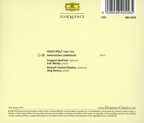 Italienisches Liederbuch 01. "Nr. 1 Auch kleine Dinge" 02. "Nr. 2 Nicht l?nger kann ich singen" 03. "Nr. 3 Schweig einmal still" 04. "Nr. 4 O wüsstest du" 05. "Nr. 5 Wer rief dich denn?" 06. "Nr. 6 Hoff?rtig seid ihr" 07. "Nr. 7 Was soll der Zorn" 08. "Nr. 8 Wie soll ich fr?hlich sein" 09. "Nr. 9 Verschling der Abgrund meines Liebsten Hütte" 10. "Nr. 10 Gesegnet sei, durch den die Welt entstund" 11. "Nr. 11 Ich esse nun mein Brot" 12. "Nr. 12 Nun lass uns Frieden schließen" 13. "Nr. 13 Wenn du, mein Liebster" 14. "Nr. 14 Wir haben beide lange Zeit geschwiegen" 15. "Nr. 15 Was für ein Lied" 16. "Nr. 16 Mein Liebster singt" 17. "Nr. 17 Selig ihr Blinden" 18. "Nr. 18 Wohl kenn' ich euren Stand" 19. "Nr. 19 Benedeit die sel'ge Mutter" 20. "Nr. 20 Man sagt mir" 21. "Nr. 21 Sterb'ich, so hüllt in Blumen" 22. "Nr. 22 Mir ward gesagt" 23. "Nr. 23 Und willst du deinen Liebsten" 24. "Nr. 24 Schon streckt' ich aus" 25. "Nr. 25 Heut' Nacht erhob ich mich" 26. "Nr. 26 Heb' auf dein blondes Haupt" 27. "Nr. 27 O w?r' dein Haus durchsichtig" 28. "Nr. 28 Und steht ihr früh am Morgen auf" 29. "Nr. 29 Gesegnet sei das Grün" 30. "Nr. 30 Dass doch gemalt" 31. "Nr. 31 Wenn du mich mit den Augen streifst" 32. "Nr. 32 Ihr jungen Leute" 33. "Nr. 33 Der Mond hat eine schwere Klag" 34. "Nr. 34 Du denkst mit einem F?dchen" 35. "Nr. 35 Geselle, woll'n wir uns in Kutten hüllen" 36. "Nr. 36 Mein Liebster ist so klein" 37. "Nr. 37 Ein St?ndchen euch zu bringen" 38. "Nr. 38 Nein, junger Herr" 39. "Nr. 39 Ihr seid die Allersch?nste" 40. "Nr. 40 Wie lange schon" 41. "Nr. 41 Wie viele Zeit verlor ich" 42. "Nr. 42 Mein Liebster hat zur Tische" 43. "Nr. 43 Ich ließ mir sagen" 44. "Nr. 44 Du sagst mir" 45. "Nr. 45 Lass sie nur gehen" 46. "Nr. 46 Ich hab' in Penna einen Liebsten wohnen"