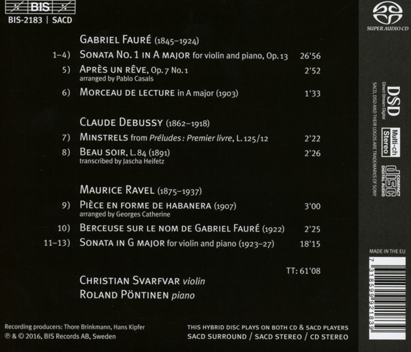 Sonate für Violine und Klavier Nr. 1 A-Dur op. 13 01. "1. Allegro molto" 02. "2. Andante" 03. "3. Allegro vivo" 04. "4. Allegro quasi presto" M?lodies op. 7 Nr. 1-3 (Trois m?lodies) (Auszug) 05. "Nr. 1 Apr?s un r?ve (arr. für Violine und Klavier von Pablo Casals)" Morceau de lecture A-Dur 06. "Quasi adagio" Pr?ludes (12 Stücke für Klavier, Heft 1) (Auszug) 07. "Nr. 12 Minstrels" 08. "Beau soir (Lorsque au soleil) (transkr. für Violine und Klavier von Jascha Heifetz)" Pi?ce en forme d'Habanera 09. "Presque lent et avec indolence" Berceuse sur le nom de Gabriel Faur? 10. "Simplice" Sonate für Violine und Klavier G-Dur 11. "1. Allegretto" 12. "2. Blues: Moderato" 13. "3. Perpetuum mobile: Allegro"