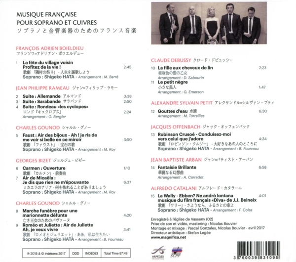 01. Hata, Shigeko "La f?te du village voisin - Profitez de la vie!" Suite 02. Quintette Magnifica "1. Allemande" 03. Quintette Magnifica "2. Sarabande" 04. Quintette Magnifica "3. Rondo "Les cyclopes"" Faust (Oper in 5 Akten) (Auszug) 05. Hata, Shigeko "Ah! Je ris de me voir si belle en ce miroir" Carmen (Oper in 4 Akten) (Auszug) 06. Hata, Shigeko "Ouvertüre" 07. Hata, Shigeko "Je dis que rien ne m'?pouvante" 08. Hata, Shigeko "Marche fun?bre d'une marionnette (Trauermarsch einer Marionette)" Rom?o et Juliette (Romeo und Julia, Oper in 5 Akten) (Auszug) 09. Hata, Shigeko "Ah, je veux vivre" 10. Quintette Magnifica "La fille aux cheveux de lin" 11. Quintette Magnifica "Le petit n?gre" 12. Quintette Magnifica "Gouttes d'eau" Robinson Cruso? (Auszug) 13. Hata, Shigeko "Conduisez-moi vers celui que j'adore" 14. Quintette Magnifica "Fantaisie brillante" La Wally (Oper in 4 Akten) (Auszug) 15. Hata, Shigeko "Ebben? Ne andr? ontana"