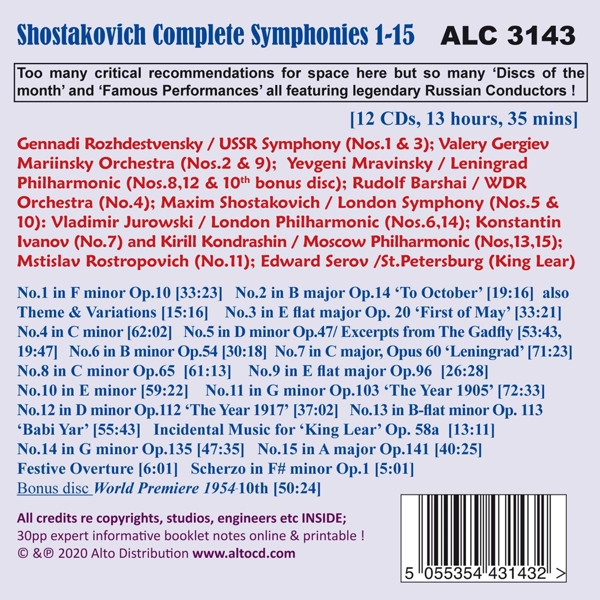 | Beschreibung: | Runningtime: 00:00:00, Composed By: Dmitri Shostakovich, Conductor: Eduard Serov, Conductor: Evgeny Mravinsky, Conductor: Gennadi Rozhdestvensky, Conductor: Kiril Kondrashin, Conductor: Konstantin Ivanov, Conductor: Maxim Shostakovich, Conductor: Mstislav Rostropovich, Conductor: Rudolf Barshai, Conductor: Valery Gergiev, Conductor: Vladimir Jurowski, Orchestra: Leningrad Philharmonic Orchestra, Orchestra: London Philharmonic Orchestra, Orchestra: London Symphony Orchestra, Orchestra: Moscow Philharmonic Orchestra, Orchestra: Orchestra Of The Mariinsky Theatre, Orchestra: St. Petersburg Chamber Orchestra, Orchestra: WDR Sinfonieorchester Köln, Orchestra: ??????? ????????????? ??????? ??????????? ?????, Remastered By: Paul Arden-Taylor, Labelcode ALC3143 (ALC 3143), Phonographic Copyright (p) Alto Distribution, Copyright (c) Alto Distribution, Licensed From CDK Music |  | Herstellernummer: |