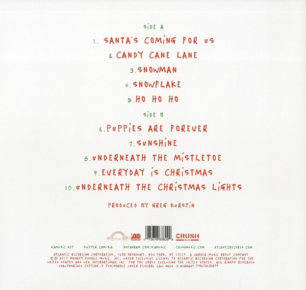 Beschreibung:A&R [Administration]: Anne DeClemente, Art Direction: Leigh Poindexter, Art Direction: Sia, Concept By: Sia, Design: Virgilio Tzaj, Engineer: Alex Pasco, Engineer: Greg Kurstin, Engineer: Julian Burg, Engineer [For Mix]: John Hanes, Make-Up [Glam]: Tonya Brewer, Management: Bob McLynn (2), Management: Crush Music Media Management, Management: David Russell (6), Management: Jonathan Daniel, Management [Business Affairs For Atlantic]: Margo Scott, Mastered By: Chris Gehringer, Mixed By: Serban Ghenea, Photography By: RJ Shaughnessy, Producer: Greg Kurstin, Stylist [Wardrobe]: Samantha Burkhart, Written-By: Greg Kurstin, Written-By: Sia Furler, Drums, Bass, Piano, Keyboards, Guitar: Greg Kurstin, Trumpet, Trombone, Tenor Saxophone, Baritone Saxophone, Bass Saxophone: David Ralicke, Drums, Bass, Guitar, Percussion, Organ, Piano, Vibraphone: Greg Kurstin, Drums, Bass, Piano, Keyboards: Greg Kurstin, Drums, Bass, Piano, Keyboards, Celesta [Celeste]: Greg Kurstin, Drums, Bass, Piano, Keyboards, Guitar, Pump Organ: Greg Kurstin, Trumpet, Mellophone, Trombone, Euphonium, Soprano Saxophone, Baritone Saxophone, Bass Saxophone: David Ralicke, Drums, Bass, Guitar, Keyboards, Mellotron, Percussion: Greg Kurstin, Drums, Bass, Guitar, Percussion, Piano, Keyboards, Celesta [Celeste], Whistling: Greg Kurstin, Drums, Bass, Baritone Guitar, Piano, Celesta [Celeste], Keyboards, Glockenspiel: Greg Kurstin, Drums, Bass, Guitar, Piano, Mellotron: Greg Kurstin, Piano, Bass, Keyboards, Mellotron: Greg Kurstin, Labelcode ATLK7863829.1 (075678638299, 075678638299), Record Company Crush Music (2), Record Company Atlantic Recording Corporation, Record Company Warner Music Group, Phonographic Copyright (p) Monkey Puzzle Music, Inc., Copyright (c) Monkey Puzzle Music, Inc., Licensed To Atlantic Recording Corporation, Licensed To WEA International Inc., Published By Pineapple Lasagne, Published By Sony/ATV Music Publishing Ltd., Published By Kurstin Music, Published By EMI April Music Inc.