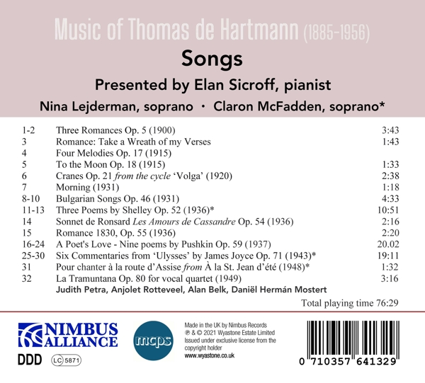 Romanzen op. 5 Nr. 1-3 (Auszug) 01. Lejderman, Nina "Nr. 1 The lark" 02. Lejderman, Nina "Nr. 3 Calmly a cloud floats" 03. Lejderman, Nina "Take a wreath of my verses (Romanze)" Melodien op. 17 Nr. 1-4 (Auszug) 04. Lejderman, Nina "Nr. 4 Vision of Pushkin" 05. Lejderman, Nina "To the moon op. 18" Volga (Auszug) 06. Lejderman, Nina "Cranes" 07. Lejderman, Nina "Morning" Bulgarische Lieder op. 46 08. Lejderman, Nina "The green forest" 09. Lejderman, Nina "The unploughed field" 10. Lejderman, Nina "The homing flight" Poems by Shelley op. 52 Nr. 1-3 11. McFadden, Claron "Nr. 1 Hymn of Pan" 12. McFadden, Claron "Nr. 2 Time" 13. McFadden, Claron "Nr. 3 Indian serenade" 14. Lejderman, Nina "Les amours de Cassandre op. 54 (Sonett von Ronsard)" 15. Lejderman, Nina "Romanze 1830 op. 55" A poet's love op. 59 (9 Gedichte von Pushkin) 16. Lejderman, Nina "Nr. 1 The nereid" 17. Lejderman, Nina "Nr. 2 I remember the sea before the storm" 18. Lejderman, Nina "Nr. 3 Night" 19. Lejderman, Nina "Nr. 4 I still recall the magical moment" 20. Lejderman, Nina "Nr. 5 The nightingale and the rose" 21. Lejderman, Nina "Nr. 6 Omens" 22. Lejderman, Nina "Nr. 7 I loved you once" 23. Lejderman, Nina "Nr. 8 What means my name to you?" 24. Lejderman, Nina "Nr. 9 The last flowers" Commentaries from Ulysses by James Joyce op. 71 Nr. 1-6 25. McFadden, Claron "Nr. 1 Introduction" 26. McFadden, Claron "Nr. 2 Complaint about the will" 27. McFadden, Claron "Nr. 3 Waltz of the hours" 28. McFadden, Claron "Nr. 4 Eclogue" 29. McFadden, Claron "Nr. 5 Cuckoo" 30. McFadden, Claron "Nr. 6 Night at Gibraltar" A la St. Jean d'?t? (Auszug) 31. Lejderman, Nina "Pour chanter ? la route d'Assise" 32. Petra, Judith "Ta Tramuntana op. 80 (für Vokalquartett)"