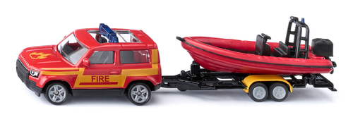 Beschreibung:Der Land Rover Defender in der Feuerwehr-Version ist bereit für anspruchsvolle Einsätze auf jedem Terrain ? ob steile Berge, tiefe Schluchten oder unwegsame Straßen. Mit seiner Metall-Karosserie, dem robusten Kunststoff-Fahrgestell und den sportlichen Gummireifen meistert der Defender sicher jeden Weg, sei es im Garten, am Spielplatz oder in der Sammlung. Die Lackierung und die silbernen Felgen verleihen ihm einen unverwechselbaren Look, während das klarverglaste Sonnendach den Blick ins Wageninnere freigibt. Scheinwerfer und Heckleuchten sind originalgetreu nachgebildet, und das Ersatzrad am Heck unterstreicht die Einsatzbereitschaft. Dank der serienmäßig integrierten Anhängerkupplung zieht der Defender spielend leicht das mitgelieferte Kunststoff-Motorboot auf seinem Trailer mit Metallrahmen zum nächsten Einsatzort. Ob zu Land oder auf dem Wasser ? mit diesem beeindruckenden Modell-Set steht spannenden Rettungsmissionen nichts im Wege!