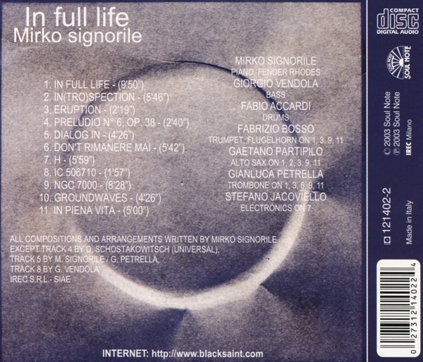 01. "In full life" 02. "In(tro)spection" 03. "Eruption" 04. "Preludio Nø 6, op. 38" 05. "Dialog in" 06. "Don't rimanere mai" 07. "H" 08. "IC 506710" 09. "NGC 7000" 10. "Groundwaves" 11. "In piena vita"