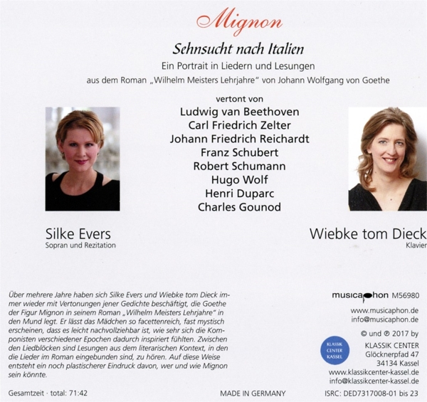 01. "Lieder op. 75 Nr. 1-6 (Auszug)" 02. "Sehnsucht (Nur wer die Sehnsucht kennt) WoO 134" 03. "Lesung: Mignons Eigenarten" 04. "Nur wer die Sehnsucht kennt" 05. "Geheimnis: Heiss mich nicht reden" 06. "Lesung: Bericht von Mignons Herkunft" 07. "Lied der Mignon (Heiß mich nicht reden, heiß mich schweigen) op. 62 Nr. 2 D 877,2" 08. "Lied der Mignon (So laß mich scheinen, bis ich werde) op. 62 Nr. 3 D 877,3" 09. "Lied der Mignon (Nur wer die Sehnsucht kennt) op. 62 Nr. 4 D 877,4" 10. "Mignons Gesang (Kennst du das Land, wo die Zitronen blühn) D 321" 11. "Lesung: Mignons Liedinterpretation" Lieder op. 98a (Lieder und Ges?nge aus Goethes Wilhelm Meister) (Auszug) 12. "Nr. 1 Kennst du das Land" 13. "Nr. 3 Nur wer die Sehnsucht kennt" 14. "Nr. 5 Heiss mich nicht reden" 15. "Nr. 9 So lass mich scheinen" 16. "Lesung: Mignons Anfall" 17. "Mignons Lied (Kennst du das Land, wo die Zitronen blühn) (Goethe)" 18. "Mignon I (Heiß mich nicht reden, heiß mich schweigen) (Goethe)" 19. "Mignon II (Nur wer die Sehnsucht kennt) (Goethe)" 20. "Mignon III (So laßt mich scheinen bis ich werde) (Goethe)" 21. "Lesung: Mignons Auftritt als Engel" 22. "Romance de Mignon" 23. "Mignon (Po?sie de Louis Gallet)"