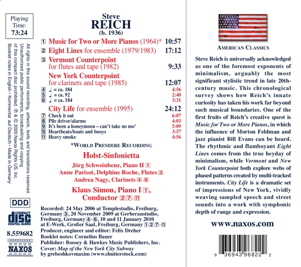 01. Simon, Klaus "Music for two or more pianos (1964)" 02. Simon, Klaus "Eight lines (für Ensemble) (1979/83)" 03. Roche, Delphine "Vermont Counterpoint (für Fl?ten und Tape) (1982)" New York Counterpoint (für Klarinetten und Tape) (1985) 04. Hagy, Andrea "1. Viertel = 184" 05. Hagy, Andrea "2. Viertel = 92" 06. Hagy, Andrea "3. Viertel = 184" City Life (für Ensemble) (1995) 07. Simon, Klaus "1. Check it out" 08. Simon, Klaus "2. Pile driver/alarms" 09. Simon, Klaus "3. It's been a honeymoney - can't take no mo'" 10. Simon, Klaus "4. Heartbeats/Boats and buoys" 11. Simon, Klaus "5. Heavy smoke"