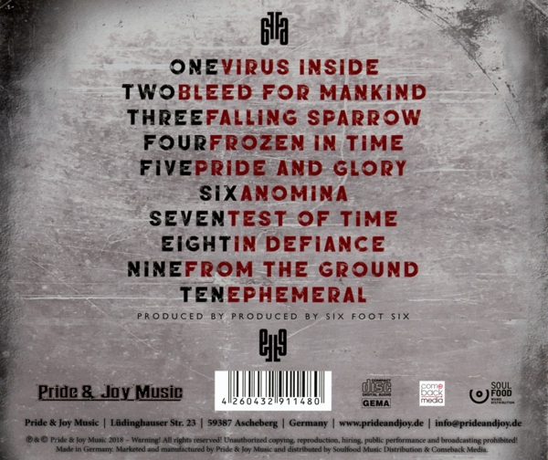 01. "Virus inside" 02. "Bleed for mankind" 03. "Falling sparrow" 04. "Frozen in time" 05. "Pride and glory" 06. "Anomina" 07. "Test of time" 08. "In defiance" 09. "From the ground" 10. "Ephemeral"