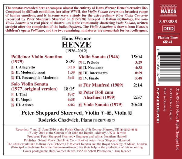 Beschreibung:The sonatas recorded here encompass almost the entirety of Hans Werner Henze's creative life. Composed in difficult conditions just after WWII, the Violin Sonata covers the broadest range of human emotions, and is in some ways a study for the extraordinary First Violin Concerto. Steeped in Italian mythology, the Solo Violin Sonata is 'a real piece of theatre,' as is the emotionally shattering Viola Sonata, written straight after the completion of the ballet Orpheus. The Violin Sonatina is drawn from Henze's children's opera Pollicino, and the two remaining miniatures are memorials for lost colleagues. Internationally acclaimed violin virtuoso Peter Sheppard Skaerved's close connection with Hans Werner Henze is well recognized, and this release follows on from his recordings of Henze's First and Third Violin Concertos "having some seriously emotional meat on the bones of this traditional form" (MusicWeb International), and the Second Violin Concerto summed up as "a superb [album]... highly recommended" by Gramophone. This is the first recording to bring together Henze's solo sonatas for violin and viola, as well as the early Violin Sonata and later Violin Sonatina. Peter Sheppard Skaerved recorded the composers revised 1992 version of the Solo Violin Sonata on the Metier label in 2000, but returns to the 1977 original for this recording, completing a deal with the composer to "see who is right!", Runningtime: 00:00:00, Labelcode NXS8573886.2