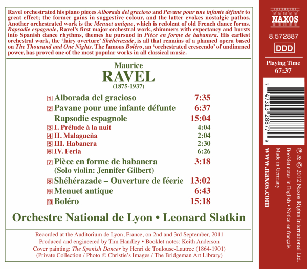 01. Orchestre National de Lyon "Alborada del gracioso" 02. Orchestre National de Lyon "Pavane pour une Infante d?funte" Rhapsodie espagnole 03. Orchestre National de Lyon "1. Pr?lude ? la nuit" 04. Orchestre National de Lyon "2. Malague¤a" 05. Orchestre National de Lyon "3. Habanera" 06. Orchestre National de Lyon "4. Feria" 07. Gilbert, Jennifer "Pi?ce en forme d'Habanera" 08. Orchestre National de Lyon "Scheherazade-Ouvertüre (Ouverture de f?erie)" 09. Orchestre National de Lyon "Menuet antique (für Orchester)" 10. Orchestre National de Lyon "Bol?ro"
