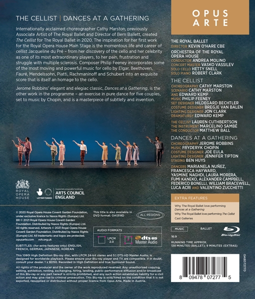 | | Beschreibung: | Internationally acclaimed choreographer Cathy Marston, previously Associate Artist of The Royal Ballet and Director of Bern Ballett, created The Cellist for The Royal Ballet in 2020. The inspiration for her first work for the Royal Opera House Main Stage is the momentous life and career of cellist Jacqueline du Pre - from her discovery of the cello and her celebrity as one of it's most extraordinary players, to her pain, frustration and struggle with multiple sclerosis. Composer Philip Feeney incorporates some of the most moving and powerful music for cello by Elgar, Beethoven, Faure, Mendelssohn, Piatti, Rachmaninoff and Schubert into an exquisite score that is itself an homage to the cello. Jerome Robbins' elegant and elegiac classic, Dances at a Gathering, is the other work in the programme.' pure dance for five couples, set to music by Chopin, is a masterpiece of subtlety and invention.", Runningtime: 00:00:00, Labelcode BOPU7277BR |  | | Darsteller: |