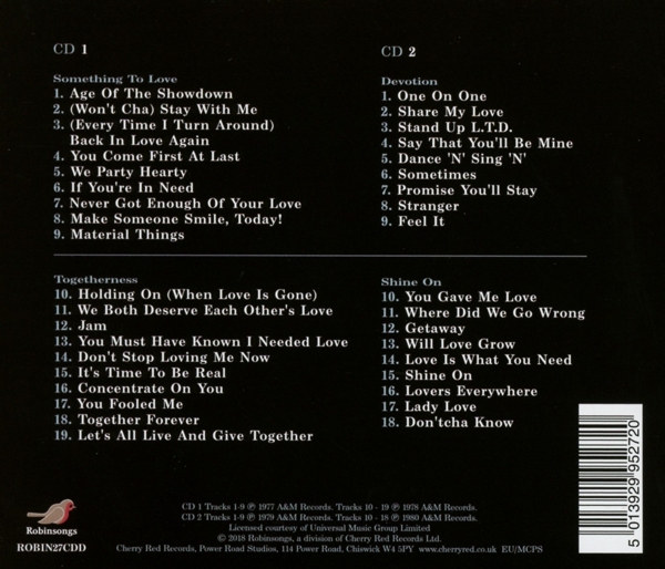 Disc 01 01. "Age of the showdown" 02. "(Won't cha) Stay with me" 03. "(Every time I turn around) Back in love again" 04. "You come first at last" 05. "We party hearty" 06. "If you're in need" 07. "Never got enough of your love" 08. "Make someone smile, today!" 09. "Material things" 10. "Holding on (when love is gone)" 11. "We both deserve each other's love" 12. "Jam" 13. "You must have known I needed love" 14. "Don't stop loving me now" 15. "It's time to be real" 16. "Concentrate on you" 17. "You fooled me" 18. "Together forever" 19. "Let's all live and give together"