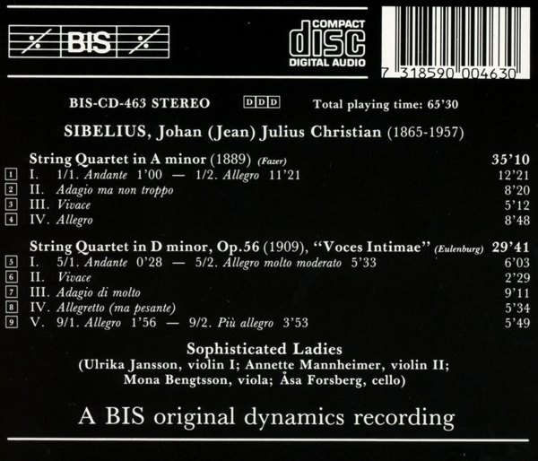 Streichquartett a-moll o. op. 01. "1. Andante - Allegro" 02. "2. Adagio ma non troppo" 03. "3. Vivace" 04. "4. Allegro" Streichquartett d-moll op. 56 "Voces intimae" 05. "1. Andante - Allegro molto moderato" 06. "2. Vivace" 07. "3. Adagio di molto" 08. "4. Allegretto (ma pesante)" 09. "5. Allegro - Pi? allegro"