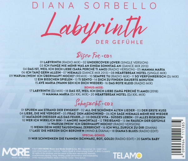 : Disco Fox () 1-1: Labyrinth (Radio Mix) (3:18) 1-2: Undercover Lover (Single Version) (3:27) 1-3: Ich Fange Nie Mehr Was An Einem Sonntag An (Dance Mix 2013) (3:12) 1-4: Das Ist, Weil Ich Dich Liebe (Sarà Perché Ti Amo) (Radio Version) (2:48) 1-5: Mamma Maria (3:00) 1-6: Ich Tanz Gern Allein (3:15) 1-7: Niemals (Dance Mix 2013) (3:14) 1-8: Heartbreak Hotel (Single Mix) (3:19) 1-9: Warum (Wein' Ich überhaupt Noch)? (Remix) (3:30) 1-10: Sempre Tu (Radio Mix) (3:46) 1-11: So Verführerisch (DJ Mix) (3:43) 1-12: Ein Bisschen Spielen (3:30) 1-13: Ti Sento (3:22) 1-14: Dich Zu Finden Dauerte Minuten (3:15) 1-15: Ave Maria (Wann Seh Ich Dich Wieder) (3:36) 1-16: Das Rote Kleid (Radio Mix) (3:04) : Bonus-Mixe: () 1-17: Labyrinth (DJ Mix) (3:18) 1-18: Das Ist, Weil Ich Dich Liebe (Sarà Perché Ti Amo) (2018) (2:49) 1-19: Mamma Maria (DJ XXL Mix) (4:23) 1-20: Heartbreak Hotel (DJ XXL Mix) (4:15) : Sehnsucht () 2-1: Spuren Am Strand Der Ewigkeit (3:41) 2-2: All Die Schönen Alten Lieder (2:39) 2-3: Der Erste Kuss (3:23) 2-4: Liebe, Die Nie Vergeht (3:17) 2-5: Frag Den Abendwind (3:03) 2-6: Ich Sage Niemals Mehr Nie Wieder (3:49) 2-7: Matador (Heisser Als Das Feuer...) (3:04) 2-8: Dolce Vita - Süsses Leben (3:04) 2-9: Alles Riskieren (3:30) 2-10: Wer Ich Wirklich Bin (3:37) 2-11: Amore Immortale (3:46) 2-12: Treibsand (3:26) 2-13: Im Rausch Der Gefühle (3:51) 2-14: Warum (Wein' Ich überhaupt Noch)? (Radio Version) (3:01) 2-15: Wenn Dein Herz Tausendmal Zerbricht (3:43) 2-16: Ich Will Zurück Zu Dir (4:10) 2-17: Lass' Die Herzen Sich Berühr'n (2:46) 2-18: Diana's Blues (Radio Edit) (3:55) : Special-Songs () 2-19: Wir Schwenken Die Fahnen (Schwarz, Rot, Gold) (Radio Edit) (3:20) 2-20: Santa Baby (2:36)