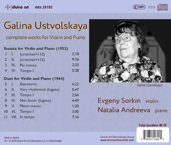 Beschreibung: | Unfairly named 'The Lady with the Hammer' for her uncompromising use of massive thunderous chords and ostinato rhythms, Ustvolskaya was a pupil of Shostakovich but forged her own unique way into many genres. Recently, artists have concentrated, as here, on bringing out the richness of the works and their innate lyricism. This album includes all of the composer's music for violin and piano in two major works - the Sonata and the Duet. Russian violinist Evgeny Sorkin was a child prodigy and performed for Isaac Stern at the age of 10 and was compared at 16 to David Oistrakh by no less than Yehudi Menuhin. He moved to Australia and balanced teaching at Sydney Conservatory with a busy recital schedule. Natalia Andreeva is a Russian pianist who is currently Lecturer in Piano at the University of Sydney, Australia. Her 2015 recording of the complete solo piano music of Galina Ustvolskaya was very well received; she is a pianist of consummate skill who can express the power and lyricism which exist side by side in these works., Runningtime: 00:00:00, Labelcode DVRT25182.2 |