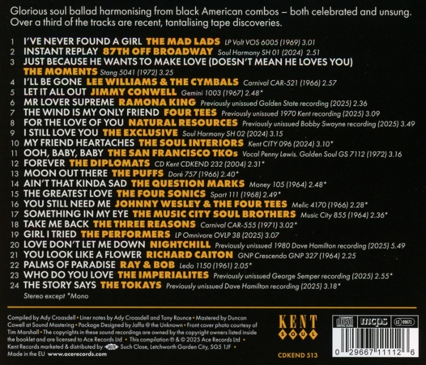 1.1 I've Never Found a Girl - the Mad Lads1.2 Instant Replay - 87th Off Broadway1.3 Just Because He Wants to Make Love1.4 (Doesn't Mean He Loves You) - the Moments1.5 I'll Be Gone - Lee Williams ; the Cymbals1.6 Let It All Out - Jimmy Conwell1.7 Mr Lover Supreme - Ramona King1.8 The Wind Is My Only Friend - the Four Tees1.9 For the Love of You - Natural Resources1.10 I Still Love You - the Exclusive1.11 My Friend Heartaches - the Soul Interiors1.12 Ooh Baby Baby - the San Francisco Tkos1.13 (Featuring Penny Lewis)1.14 Forever - the Diplomats1.15 Moon Out There - the Puffs1.16 Ain't That Kinda Sad - the Question Marks1.17 The Greatest Love - the Four Sonics1.18 You Still Need Me - Johnny Wesley ; the Four Tees1.19 Something in My Eye -The Music City Soul Brothers1.20 Take Me Back - the Three Reasons1.21 Girl I Tried - the Performers1.22 Love Don't Let Me Down - Nightchill1.23 You Look Like a Flower - Richard Caiton1.24 Palms of Paradise - Ray ; Bob1.25 Who Do You Love - the Imperialites1.26 The Story Says - the Tokays |