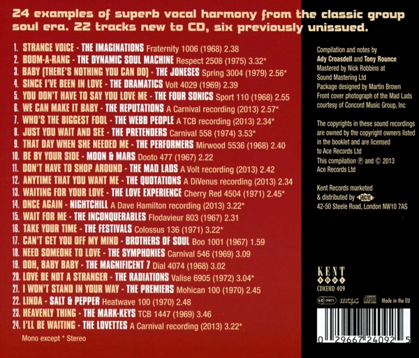 01. Imaginations, The "Strange voice" 02. Dynamic Soul Machine, The "Boom-a-rang" 03. Joneses, The "Baby (there is nothing you can do)" 04. Dramatics, The "Since I've been in love" 05. Four Sonics, The "You don't have to say you love me" 06. Reputations, The "We can make it baby" 07. Webb People, The "Who's the biggest fool" 08. Pretenders, The "Just you wait and see" 09. Performers, The "That day when she needed me" 10. Moon & Mars "Be by your side" 11. Mad Lads, The "Don't have to shop around" 12. Quotations, The "Anytime that you want me" 13. Love Experience, The "Waiting for your love" 14. Nightchill "Once again" 15. Inconquerables "Wait for me" 16. Festivals, The "Take your time" 17. brothers Of Soul "Can't get you off my mind" 18. Symphones, The "Need someone to love" 19. Magnificent 7, The "Ooh, baby baby" 20. Radiations, The "Love be not a stranger" 21. Premiers, The "I won't stand in your way" 22. Salt & Pepper "Linda" 23. Mark -Keys, The "Heavenly thing" 24. Lovelettes, The "I'll be waiting"