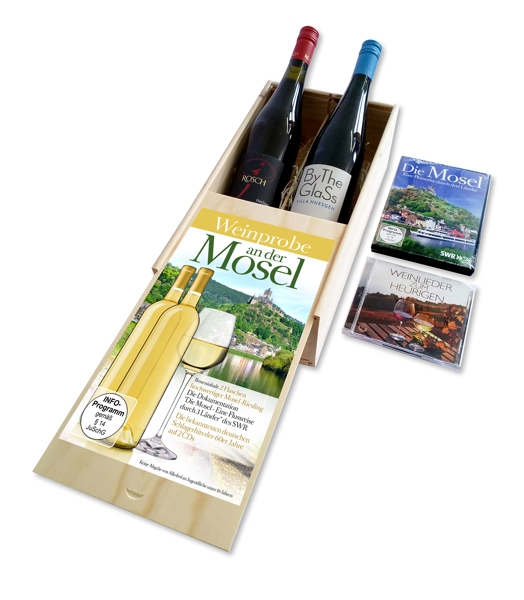 Beschreibung:Der Moselwein ist weltberühmt und lecker! Probieren Sie zwei der beliebtesten Weine bei Ihrer eigenen kleinen Weinprobe, zusammen mit der Dokumentation "Die Mosel - Eine Flussreise durch 3 Länder" des SWR und den bekanntesten deutschen Schlagerhits der 60er Jahre auf 2 CDs. Kein Rückgaberecht!