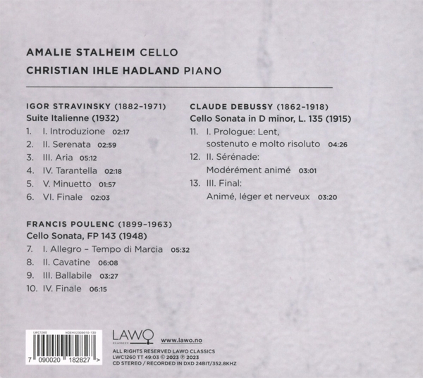 Pulcinella (Ballett): Suite italienne (für Violoncello und Klavier) 01. "1. Introduktion" 02. "2. Serenata" 03. "3. Aria" 04. "4. Tarantella" 05. "5. Menuett" 06. "6. Finale" Sonate für Violoncello und Klavier FP 143 07. "1. Allego - Tempo di marcia" 08. "2. Cavatine" 09. "3. Ballabile" 10. "4. Finale" Sonate für Violoncello und Klavier d-moll 11. "1. Prolog: Lent, sostenuto e molto risoluto" 12. "2. Serenade: Mod?r?ment anim?" 13. "3. Finale: Anim?, l?ger et nerveux"