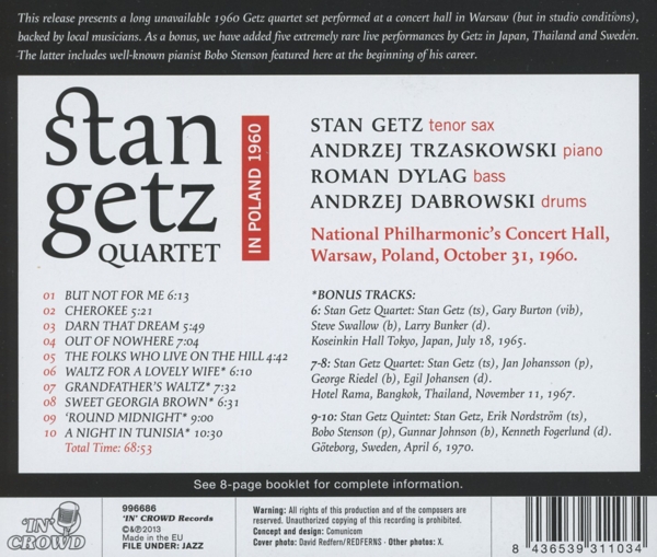 | Beschreibung: | Bass: Georg Riedel, Bass: Gunnar Johnson, Bass: Roman Dylag, Bass: Steve Swallow, Drums: Andrzej D?browski, Drums: Egil Johansen, Drums: Kenneth Fogerlund, Drums: Larry Bunker, Piano: Andrzej Trzaskowski, Piano: Bobo Stenson, Piano: Jan Johansson, Tenor Saxophone: Erik Nordström (2), Tenor Saxophone: Stan Getz, Vibraphone: Gary Burton, Labelcode ICRO3931103.2 (996686) |