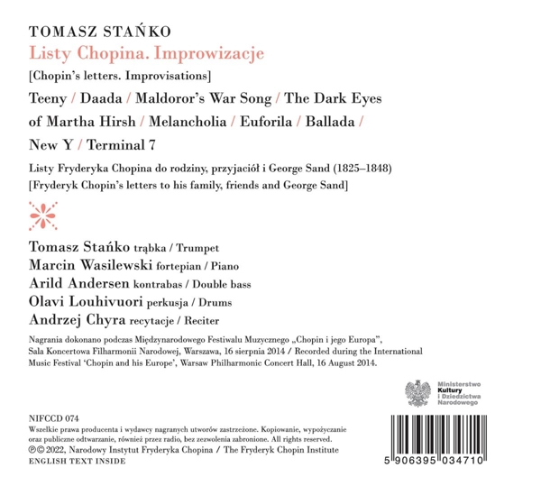 01. Andrzej Chyra "Letter to Jan Bialoblocki in Sokolowo (Warsaw, 29th September 1825)" 02. Tomasz Stanko "Teeny (Suspended Variations VI)" 03. Andrzej Chyra "Chopin's letters to Tytus Wojciechowski in Poturzyn (Warsaw, 10th April 1830) and to Jan Bialoblocki (Warsaw, toward the" 04. Tomasz Stanko "Daada" 05. Andrzej Chyra "Letter to George Sand in Nohant (Paris, 2nd December 1844)" 06. Tomasz Stanko "Maldoror's War Song" 07. Andrzej Chyra "The Dark Eyes of Martha Hirsh featuring extracts from a letter written by F. Chopin to his family (Vienna, 1st August 18" 08. Andrzej Chyra "Melancholia and Chopin's letter to Julian Fontana in Paris (Palma, 15th Nov. 1838)" 09. Andrzej Chyra "Chopin's letter to his family in Warsaw (Nohant, 18th-20th July 1845)" 10. Tomasz Stanko "Euforila" 11. Andrzej Chyra "Chopin's letter to his family in Warsaw (Paris, 11th February 1848)" 12. Tomasz Stanko "Ballada" 13. Andrzej Chyra "Chopin's letter to his family in Warsaw (Nohant 18th-20th July 1845)" 14. Tomasz Stanko "New Y" 15. Andrzej Chyra "Terminal 7 and Chopin's letters to George Sand in Nohant (Paris 17th January 1847) and Julian Fontana in Paris (Palma, 2"