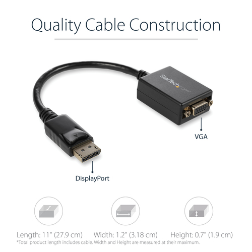 Das Produkt ".com DisplayPort auf VGA Video Adapter - DP 20 Pin (St) zu VGA 15 Pin (Bu) Konve..." von Startech hat eine Höhe von HÖHE, eine Tiefe von 279,4 mm und eine Breite von BREITE. Der Artikel ist Schwarz und ist 50 g schwer.