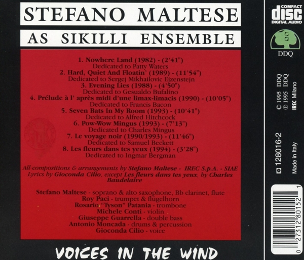 Beschreibung:Double Bass: Giuseppe Guarrella, Drums, Percussion: Antonio Moncada, Soprano Saxophone, Alto Saxophone, Clarinet [Bb], Flute: Stefano Maltese, Trombone: Rosario Patania, Trumpet, Flugelhorn: Roy Paci, Violin: Michele Conti (3), Voice: Gioconda Cilio, Lyrics By: Gioconda Cilio, Written-By: Stefano Maltese, Written-By: Stefano Maltese, Written-By: Stefano Maltese, Lyrics By: Gioconda Cilio, Written-By: Stefano Maltese, Written-By: Stefano Maltese, Written-By: Stefano Maltese, Lyrics By: Gioconda Cilio, Written-By: Stefano Maltese, Text By: Charles Baudelaire, Written-By: Stefano Maltese, Labelcode IMT883600.2 (128015-2), Phonographic Copyright (p) DDQ, Copyright (c) DDQ, Distributed By IREC Milano, Published By IREC S.p.A.
