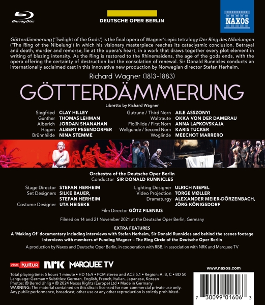 01. (keine Angaben) "Vorspann" G?tterd?mmerung (Oper in 1 Vorspiel und 3 Akten) (Gesamtaufnahme) 02. Stemme, Nina "Vorspiel (Prolog)" 03. Stemme, Nina "Welch Licht leuchtet dort?" 04. Stemme, Nina "D?mmert der Tag?" 05. Stemme, Nina "Orchesterzwischenspiel" 06. Stemme, Nina "Zu neuen Taten, teurer Helde" 07. Stemme, Nina "Lass' ich, Liebste, dich hier" 08. Stemme, Nina "Siegfrieds Rheinfahrt" 09. Stemme, Nina "Nun h?r, Hagen! Sage mit, Held (1. Akt)" 10. Stemme, Nina "Was weckst du Zweifel und Zwist!" 11. Stemme, Nina "Vom Rhein her t?nt' das Horn" 12. Stemme, Nina "Heil! Siegfried, teurer Held!" 13. Stemme, Nina "Begrüße froh, o Held, die Halle meines Vaters" 14. Stemme, Nina "Willkommen, Gast, in Gibichs Haus!" 15. Stemme, Nina "Gunther, wie heißt deine Schwester?" 16. Stemme, Nina "Blut-Brüderschaft schw?re ein Eid!" 17. Stemme, Nina "Hier sitz' ich zur Wacht" 18. Stemme, Nina "Orchesterzwischenspiel" 19. Stemme, Nina "Altgewohntes Ger?usch raunt meinem Ohr die Ferne" 20. Stemme, Nina "H?re mit Sinn, was ich dir sage!" 21. Stemme, Nina "Welch banger Tr?ume M?ren" 22. Stemme, Nina "Blitzend Gew?lk, vom Wind getragen" 23. Stemme, Nina "Brünnhild'! Ein Freier kam" 24. Stemme, Nina "Jetzt bist du mein!" 25. Stemme, Nina "Vorspiel (2. Akt)" 26. Stemme, Nina "Schl?fst du, Hagen, mein Sohn?" 27. Stemme, Nina "Orchesterzwischenspiel" 28. Stemme, Nina "Hoiho, Hagen! Müder Mann!" 29. Stemme, Nina "Hoiho! Ihr Gibichsmannen, machet euch auf!" 30. Stemme, Nina "Heil dir, Gunther! Heil dir und deiner Braut!" 31. Stemme, Nina "Was ist ihr? Ist sie entrückt?" 32. Stemme, Nina "Heil'ge G?tter! Himmlische Lenker!" 33. Stemme, Nina "Helle Wehr! Heilige Waffe!" 34. Stemme, Nina "Welches Unholds List liegt hier verhohlen?" 35. Stemme, Nina "Dir hilft kein Hirn, dir hilft keine Hand" 36. Stemme, Nina "Vorspiel (3. Akt)" 37. Stemme, Nina "Frau Sonne sendet lichte Strahlen" 38. Stemme, Nina "Ein Albe führte mich irr" 39. Stemme, Nina "Siegfried! Schlimmes wissen wir dir" 40. Stemme, Nina "Weialala leia... - Im Wasser wie am Lande" 41. Stemme, Nina "Hoiho... - Finden wir endlich, wohin du flogest?" 42. Stemme, Nina "Mime hieß ein mürrischer Zwerg" 43. Stemme, Nina "In Leid zu dem Wipfel lauscht' ich hinauf" 44. Stemme, Nina "Brünnhilde! Heilige Braut!" 45. Stemme, Nina "Trauermarsch" 46. Stemme, Nina "War das sein Horn?" 47. Stemme, Nina "Hoiho! Wacht auf!" 48. Stemme, Nina "Schweigt eures Jammers jauchzendem Schwall!" 49. Stemme, Nina "Starke Scheite schichtet mir dort" 50. Stemme, Nina "Mein Erbe nun nehm' ich zu eigen" 51. Stemme, Nina "Grane, mein Ross! Sei mir gegrüßt!" 52. (keine Angaben) "Applaus - Abspann" 53. Runnicles, Donald "A "Making Of" documentary including interviews with Stefan Herheim, Sir Donald Runnicles and behind the scenes footage" 54. (keine Angaben) "Interviews with members of Funding Wagner - The Ring Circle of the Deutsche Oper Berlin"