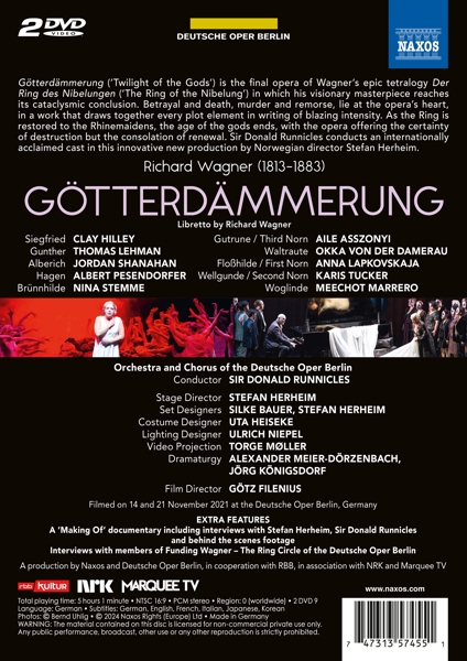 Disc 02 01. Stemme, Nina "Vorspiel (2. Akt)" 02. Stemme, Nina "Schl?fst du, Hagen, mein Sohn?" 03. Stemme, Nina "Orchesterzwischenspiel" 04. Stemme, Nina "Hoiho, Hagen! Müder Mann!" 05. Stemme, Nina "Hoiho! Ihr Gibichsmannen, machet euch auf!" 06. Stemme, Nina "Heil dir, Gunther! Heil dir und deiner Braut!" 07. Stemme, Nina "Was ist ihr? Ist sie entrückt?" 08. Stemme, Nina "Heil'ge G?tter! Himmlische Lenker!" 09. Stemme, Nina "Helle Wehr! Heilige Waffe!" 10. Stemme, Nina "Welches Unholds List liegt hier verhohlen?" 11. Stemme, Nina "Dir hilft kein Hirn, dir hilft keine Hand" 12. Stemme, Nina "Vorspiel (3. Akt)" 13. Stemme, Nina "Frau Sonne sendet lichte Strahlen" 14. Stemme, Nina "Ein Albe führte mich irr" 15. Stemme, Nina "Siegfried! Schlimmes wissen wir dir" 16. Stemme, Nina "Weialala leia... - Im Wasser wie am Lande" 17. Stemme, Nina "Hoiho... - Finden wir endlich, wohin du flogest?" 18. Stemme, Nina "Mime hieß ein mürrischer Zwerg" 19. Stemme, Nina "In Leid zu dem Wipfel lauscht' ich hinauf" 20. Stemme, Nina "Brünnhilde! Heilige Braut!" 21. Stemme, Nina "Trauermarsch" 22. Stemme, Nina "War das sein Horn?" 23. Stemme, Nina "Hoiho! Wacht auf!" 24. Stemme, Nina "Schweigt eures Jammers jauchzendem Schwall!" 25. Stemme, Nina "Starke Scheite schichtet mir dort" 26. Stemme, Nina "Mein Erbe nun nehm' ich zu eigen" 27. Stemme, Nina "Grane, mein Ross! Sei mir gegrüßt!" 28. (keine Angaben) "Applaus - Abspann" 29. Runnicles, Donald "A "Making Of" documentary including interviews with Stefan Herheim, Sir Donald Runnicles and behind the scenes footage" 30. (keine Angaben) "Interviews with members of Funding Wagner - The Ring Circle of the Deutsche Oper Berlin"