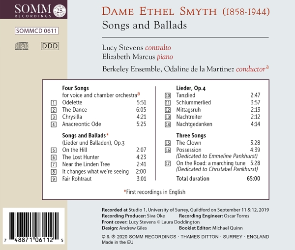 Lieder für Gesang und Kammerorchester Nr. 1-4 01. "Nr. 1 Odelette" 02. "Nr. 2 The dance" 03. "Nr. 3 Chrysilla" 04. "Nr. 4 Anakreontische Ode" Lieder und Balladen op. 3 Nr. 1-5 05. "Nr. 1 On the hill" 06. "Nr. 2 The lost hunter" 07. "Nr. 3 Near the linden tree" 08. "Nr. 4 it changes what we're seeing" 09. "Nr. 5 Fair Rohtraut" Lieder op. 4 Nr. 1-5 10. "Nr. 1 Tanzlied" 11. "Nr. 2 Schlummerlied" 12. "Nr. 3 Mittagsruh" 13. "Nr. 4 Nachtreiter" 14. "Nr. 5 Nachtgedanken" Lieder Nr. 1-3 15. "Nr. 1 The clown" 16. "Nr. 2 Possession (Emmeline Pankhurst gewidmet)" 17. "Nr. 3 On the road: A marching tune (Christabel Pankhurst gewidmet)"