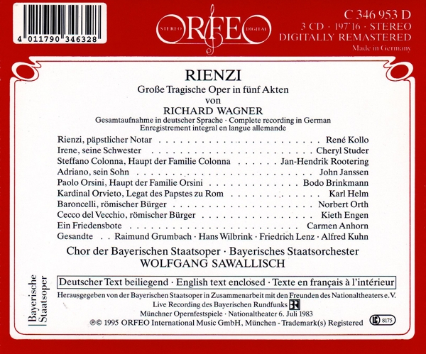 1.1 Ov - Bayerischen Staatsoper/Wolfgang Sawallisch1.2 First Act, No.1 Intro: 'Hier Ist's, Hier Ist's! Frisch Auf, Ihr Freunde' - Bodo Brinkmann/Cheryl Studer/John Janssen/Karl Helm/Rene Kollo/Norbert Orth/Keith Engen/Chor Der1.3 First Act, No.2 Terzett Und No.3 Duett: 'O Schwester, Sprich, Was Dir Geschah' - Rene Kollo/Cheryl Studer/John Janssen1.4 First Act, No.4 Finale: 'Gegrusst, Gegrusst Sei, Hoher Tag!' - Chor Der Bayerischen Staatsoper/Gunther Schmidt-Bohlander1.5 First Act, No.4 Finale: 'Rienzi! Ha, Rienzi, Hoch!' - Rene Kollo/Cheryl Studer/John Janssen/Chor Der Bayerischen Staatsoper/Gunther Schmidt-Bohlander2.1 Second Act, Ov Zu 'Rienzi's Fall'/No.5 Intro - Bayerischen Staatsoper/Wolfgang Sawallisch2.2 Second Act, No.5 Intro: 'Ihr Romer, Hort Die Kunde Des Holden Friedens An' - Chor Der Bayerischen Staatsoper/Gunther Schmidt-Bohlander2.3 Second Act, No.5 Intro: 'Du Friedensbote, Sage An, Hast Deine Sendung Du Vollbracht' - Rene Kollo/Carmen Anhorn/Chor Der Bayerischen Staatsoper/Gunther Schmidt-Bohlander/Norbert Orth2.4 Second Act, No.5 Intro: 'Rienzi, Nimm Des Friedens Gruss!' - Jan-Hendik Rootering/Rene Kollo2.5 Second Act, No.6 Szene, Terzett Und Chor: 'Colonna, Hortest Du Das Freche Wort' - Bodo Brinkmann/Jan-Hendik Rootering/Chor Der Bayerischen Staatsoper/Gunther Schmidt-Bohlander2.6 Second Act, No.7 Finale: 'Erschallet, Feierklange! Stimmt Jubellieder An!' - Chor Der Bayerischen Staatsoper/Gunther Schmidt-Bohlander2.7 Second Act, No.7 Finale: 'Seid Mir Gegrusst, Ihr Romer All!' - Rene Kollo/Norbert Orth/Raimund Grumbach/Hans Wilbrink/Friedrich Lenz/Alfred Kuhn/Keith Engen2.8 Second Act, No.7 Finale: 'Ihr Romer, Es Beginnt Das Fest' - Chor Der Bayerischen Staatsoper/Gunther Schmidt-Bohlander2.9 Second Act, No.7 Finale: Pantomime: 'Rienzi Auf! Schutzt Den Tribun!' - Rene Kollo/Norbert Orth/Jan-Hendik Rootering/Chor Der Bayerischen Staatsoper/Gunther Schmidt-Bohland2.10 Second Act, No.7 Finale: 'Den Heil'gen Dank, Er Ist Allein!' - John Janssen/Cheryl Studer/Rene Kollo/Norbert Orth/Jan-Hendik Rootering/Keith Engen/Chor Der2.11 Third Act, No.8 Intro Und Ens: 'Vernahmt Ihr All' Die Kunde Schon?' - Norbert Orth/Keith Engen/Rene Kollo/Chor Der Bayerischen Staatsoper/Gunther Schmidt-Bohlander2.12 Third Act, No.9 Szene Und Arie: 'Gerechter Gott! So Ist's Entschieden Schon!' - John Janssen3.1 Third Act, No.10 Finale: Marsch - Bayerischen Staatsoper/Wolfgang Sawallisch3.2 Third Act, No.10 Finale: 'Der Tag Ist Da, Die Stunde Naht' - Norbert Orth/John Janssen/Chor Der Bayerischen Staatsoper/Gunther Schmidt-Bohlander3.3 Third Act, No.10 Finale: 'Auf Romer, Auf! Fur Freiheit Und Gesetze' - John Janssen/Cheryl Studer/Chor Der Bayerischen Staatsoper/Gunther Schmidt-Bohlander3.4 Third Act, No.10 Finale: 'Heil, Roma, Dir? Du Hast Gesiegt' - Rene Kollo/Norbert Orth/John Janssen/Keith Engen/Cheryl Studer/Chor Der Bayerischen Staatsoper3.5 Fourth Act, No.11 Intro, Terzett Und Chor: 'Wer War's, Der Euch Hier Her Beschied' - Norbert Orth/Keith Engen/John Janssen/Chor Der Bayerischen Staatsoper/Gunther Schmidt-Bohlander3.6 Fourth Act, No.12 Finale: 'Ihr Nicht Beim Feste?' - Rene Kollo/John Janssen/Chor Der Bayerischen Staatsoper/Gunther Schmidt-Bohlander3.7 Fourth Act, No.12 Finale: 'Zuruck! Dem Reinen Nur Erschliesst Die Kirche Sich!' - Karl Helm/John Janssen/Cheryl Studer/Rene Kollo/Chor Der Bayerischen Staatsoper3.8 Fifth Act, No.13 Intro Und Gebet: 'Allmacht'ger Vater, Blick Herab' - Rene Kollo3.9 Fifth Act, No.14 Duo: 'Verlasst Die Kirche Mich' - Rene Kollo/Cheryl Studer3.10 Fifth Act, No.15 Szene Und Duo: 'Du Hier Irene? Treff' Ich Dich Noch' - John Janssen/Cheryl Studer3.11 Fifth Act, No.16 Finale: 'Herbei! Herbei! Auf, Eilt Zu Uns!' - Rene Kollo/Norbert Orth/Keith Engen/John Janssen/Chor Der Bayerischen Staatsoper |