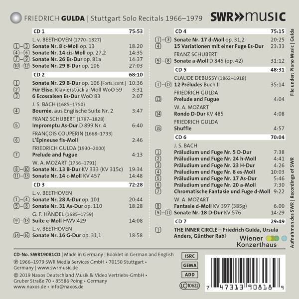 This is the first of four releases that feature the SWR recordings of Friedrich Gulda. All recordings on this album are being released here for the first time. The recording of the "Inner Circle" on album 7 is to date the only one of Guldas jazz ensemble. The series contains, among solo repertoire and concerts, also compositions by Freidrich Gulda himself. The whole series is thus an extensive documentation of Guldas music universe. Friedrich Gulda began his career in music studying at the Vienna Music Academy. He went on to win first prize at the 1946 Geneva International Music Competition, and made his Carnegie Hall debut in 1950. While most renowned for his Mozart and Beethoven interpretations, he is also remembered for his free improvisation and jazz interests., Runningtime: 00:00:00, Labelcode HAC19081.2
