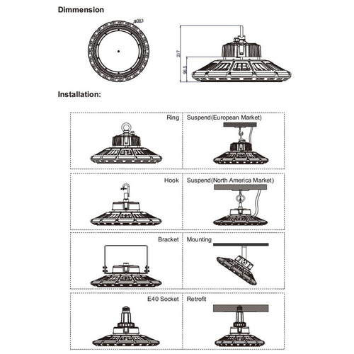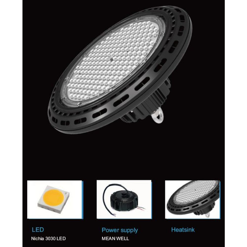AC 90-305V/50-60Hz Dimmbar: nein Leistung: 160 Watt Lichtstrom: 21600 lm Effizienz: 135lm/W Abstrahlwinkel: 120° CRI Ra: > 80 Lichtfarbe: neutralweiß Kelvin: 4000K ± 10% Arbeitstemp: -40 bis +55°C Schutzklasse: IP65, IK10, "D" Kennzeichen nach EN 60598-2-24 Gewicht: 4,8Kg Durchmesser: 325mm Höhe komplett: 187,5mm