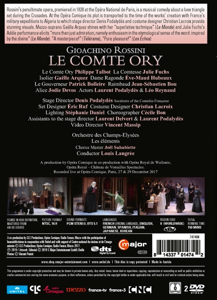 Beschreibung:Rossini's penultimate opera, premiered in 1828 at the Opéra National de Paris, is a musical comedy about a love triangle set during the Crusades. At the Opéra Comique it's plot is transported to the time of the works' creation with France's military expeditions to Algeria. It is staged by a first-rate creative team: Stage director Denis Podalydès and costume designer Christian Lacroix provide stunning visuals, whilst conductor Louis Langrée leads the Orchestre des Champs-Élysées, the Choeur Les éléments and a stellar cast of soloists in this delightful fool's game. Mezzo-soprano Gaëlle Arquez shines with her "superlative technique" (Le Monde) and Julie Fuchs's Adèle performance elicits "more than just admiration, namely enthusiasm in the etymological sense of the word: inspired by the divine" (Le Monde). "A masterpiece!" (Télérama), "Pure pleasure!" (Les Échos). Le Comte Ory at the Opéra Comique is "a true musical and theatrical celebration where everything sparkles!" (Bachtrack), Runningtime: 00:00:00, Labelcode CMAJ747408DVD