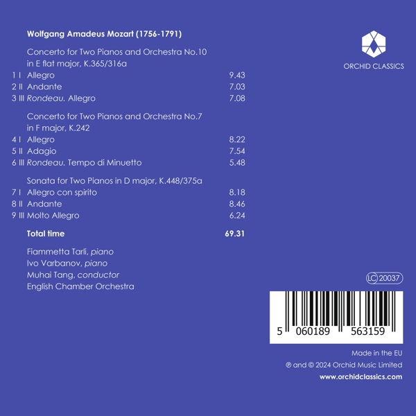 Konzert für Klavier und Orchester Nr. 10 Es-Dur KV 365 (316a) (für 2 Klaviere) 01. "1. Allegro" 02. "2. Andante" 03. "3. Rondo: Allegro" Konzert für Klavier und Orchester Nr. 7 F-Dur KV 242 "Lodron-Konzert" (für 2 Klaviere) 04. "1. Allegro" 05. "2. Adagio" 06. "3. Rondo: Tempo di Minuetto" Sonate für 2 Klaviere D-Dur KV 448 (375a) 07. "1. Allegro con spirito" 08. "2. Andante" 09. "3. Molto Allegro"