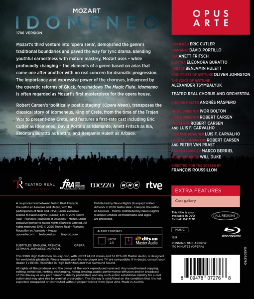 | Beschreibung: | Mozart's third venture into the "opera seria" genre, demolished it's traditional boundaries to open the way to lyric drama. Blending youthful earnestness with mature mastery, Mozart uses - while profoundly changing - the elements of a genre based on arias that come one after another with no real concern for dramatic progression. The importance and expressive power of the choruses, influenced by the operatic reforms of Gluck, foreshadows The Magic Flute. Idomeneo is often regarded as Mozart's first masterpiece for the opera house. After the fall of Troy, King Idomeneo can finally dream of returning to his homeland after a long absence, during which his son Idamante ensured the continuity of his reign and guarded Trojan prisoners, including Ilia, King Priam's daughter. To escape from a terrible storm that is keeping him from reaching Crete, Idomeneo promises Neptune to sacrifice the first living being he encounters upon landing. Unfortunately, it is his own son who greets him in his native land. By offering her own life in exchange for that of Idamante, whom she loves and who loves her, Illia manages to get Neptune to yield and to deliver Idomeneo from his fateful vow. Robert Carsen's "politically poetic staging" (Opera News), set in present-day Crete, features a first-rate cast including Eric Cutler as Idomeneo, David Portillo as Idamante, Anett Fritsch, as Ilia, Eleonora Buratto, as Elettra, and Benjamin Hulett as Arbace., Runningtime: 00:00:00, Labelcode BOPU7276BR |  | Darsteller: |