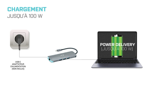 Die Station bietet außerdem einen USB-C Power Delivery Stromversorgungsport (bis zu 100 W), mit dem ein angeschlossenes Notebook oder Tablet über ihr Original-Netzteil betrieben werden kann. Die Dockin