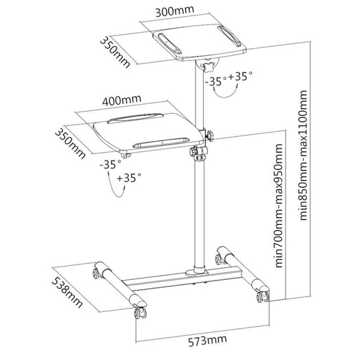 Merkmale | | Typ(en) | Multimedia-Trolley | | Produktfarbe | Weiß | | Material(ien) | Stahl, Holz | | Höchstgewichtskapazität | 10 kg | | Drehwinkel | 360 ° | | Neigungswinkelbereich | -35 - 35 ° | | Anzahl der Räder | 4 Rad/Räder | | Tastaturablage | Nein | | Höhenverstellung | Ja | Logistikdaten | | Warentarifnummer (HS) | 94031098 | Verpackungsdaten | | Verpackungsabmessungen (BxTxH) | 705 x 515 x 120 mm | Gewicht und Abmessungen | | Höhe | 120 mm | | Breite | 300 mm | | Tiefe | 350 mm | | Gewicht | 8,54 kg |