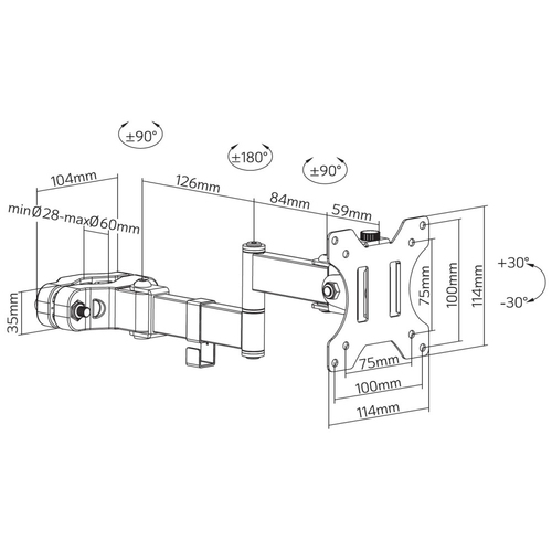 Logistikdaten | | Warentarifnummer (HS) | 85299097 | Lieferumfang | | Betriebsanleitung | Ja | | Montageset | Ja | Technische Details | | Garantiezeit | 10 Jahr(e) | | Anzahl Scharniere | 3 | | Konformitätsbescheinigungen | CE | Design | | Produktfarbe | Schwarz | | Anti-Diebstahlfunktion | Nein | | Zertifizierung | CE | Ergonomie | | Höhenverstellung | Nein | | Neigungswinkelbereich | -30 - 30 ° | | Schwenkwinkelbereich | -90 - 90 ° | | Drehungswinkel | 180 ° | | Verbessertes Kabelmanagement | Ja | | Eingebaute Wasserwaage | Nein | | Geeignet für gebogene Bildschirme | Nein | Montage | | Anzahl der Display unterstützt | 1 | | Maximale Bildschirmgröße | 81,3 cm | | Befestigungstyp | Tisch/Bank | | Höchstgewichtskapazität | 8 kg | | Minimale VESA-Halterung | 75 x 75 mm | | Maximale VESA-Halterung | 100 x 100 mm | | Minimum Bildschirmgröße | 43,2 cm | | Geeignet für Computermonitor | Ja | Gewicht und Abmessungen | | Gewicht | 1,33 kg | | Armlänge | 27 cm |