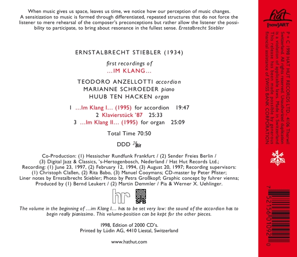 Beschreibung:Runningtime: 00:00:00, Accordion: Teodoro Anzellotti, Co-producer [Co-Production]: Digital Jazz & Classic, Co-producer [Co-Production]: Hat Hut Records, Ltd., Co-producer [Co-Production]: Hessischer Rundfunk, Co-producer [Co-Production]: Sender Freies Berlin, Composed By: Ernstalbrecht Stiebler, Design Concept [Graphic Concept]: fuhrer vienna, Liner Notes: Ernstalbrecht Stiebler, Liner Notes [German To English Translation]: Ann Holyoke Lehmann, Liner Notes [German To English Translation]: Daniel Wolf, Mastered By [CD-master]: Peter Pfister, Organ: Huub Ten Hacken, Photography By [Photo By]: Petra Großkopf, Piano: Marianne Schroeder, Producer [Produced By]: Bernd Leukert, Producer [Produced By]: Martin Demmler, Producer [Produced By]: Pia & Werner X. Uehlinger, Recording Supervisor: Christoph Claßen, Recording Supervisor: Manuel Cooymans, Recording Supervisor: Rita Babo, Labelcode HAHT109.2 (hat[now]ART 109), Phonographic Copyright (p) Hat Hut Records Ltd., Copyright (c) Hat Hut Records Ltd., Printed By Lüdin AG
