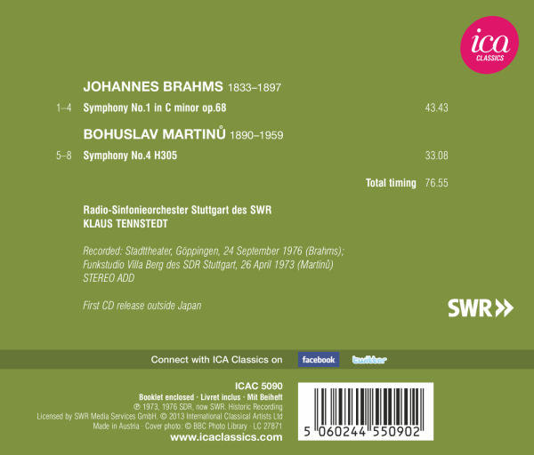 With stunning accounts of Brahms and Mahler, this recording marks an exciting, new relationship between ICA Classics and the SWR in Stuttgart, and it is the first release of this material outside Japan. 'Klaus Tennstedt's concerts with the LPO at the Festival Hall were among the greatest performances I have ever heard' (Sunday Times review of ICAC 5033, Mahler: Symphony No.3), Runningtime: 00:00:00, Labelcode ICAS5090.2