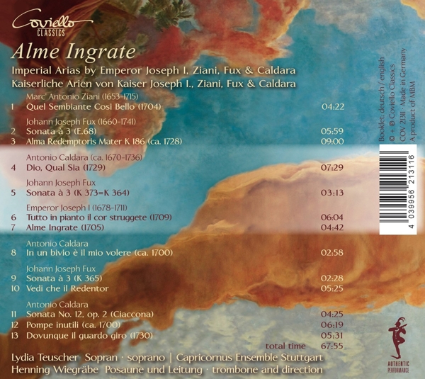 Il mistico Giobbe (Auszug) 01. "Quel sembiante cos bello" 02. "Sonate ? 3 E 68" 03. "Alma redemptoris Mater K 186" Naboth (Auszug) 04. "Dio, qual sia" 05. "Sonate ? 3 K 373" Chilonida (Auszug) 06. "Tutto in pianto il cor struggete" 07. "Alme ingrate (Sepolcro)" Maddalena ai piedi di Cristo (Auszug) 08. "In un bivio ? il mio volere" 09. "Sonata ? 3 K 365" Il fonte della salute (Auszug) 10. "Vedi che il redentor" 11. "Sonate Nr. 12 op. 2 "Ciaccona"" Maddalena ai piedi di Cristo (Auszug) 12. "Pompe inutili" La Passione di Ges? Cristo Signor Nostro (Auszug) 13. "Dovunque il guardo giro"