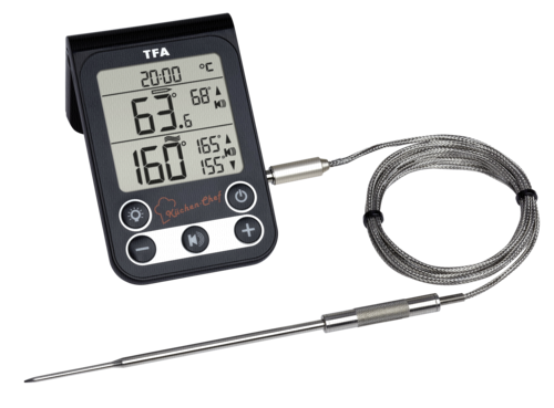 | Beschreibung: | schwarz, Einstechfühler mit 1,20 Meter KabelAnzeige: Digital, Celsius (°C), Fahrenheit (°F)Temperaturbereich: -20 °C bis 300 °CFunktionen: Signalton bei MessendeFleisch und Geflügel perfekt auf den Punkt gebraten! Kochen Sie wie ein Profi mit 100% Geling-. Denn das digitale 5,10cm (2") 1 Grill-Bratenthermometer KÜCHEN-CHEF informiert Sie, wenn die richtige Kerntemperatur erreicht ist und Ihr Fleischstück den perfekten Garzustand erreicht hat. Gleichzeitig können Sie noch die Ofentemperatur mit einer Temperaturober- und Untergrenze überwachen. Der hochwertige Einstichfühler aus Edelstahl kann während des ganzen Bratvorgangs im Backofen oder Grill bleiben. Er wird einfach in das Fleisch gesteckt und das hitzebeständige Kabel aus dem Garraum herausgeführt. Die extra-dünne Fühlerspitze sorgt für eine schnelle Messung und schont die Fleischstruktur. Ist die gewünschte Kerntemperatur erreicht oder bleibt die Ofentemperatur nicht innerhalb der einprogrammierten Grenzwerte, werden Sie per Signalton darauf aufmerksam gemacht. Stellen oder hängen Sie das Gerät in Ofennähe auf. Das Gerät ist einfach zu bedienen und durch das hell beleuchtbare Display immerWeee-Nr.: 78184127Der Artikel "Digitales Grill-/Braten-/Ofenthermometer KÜCHEN-CHEF" von Tfa-dostmann aus der Kategorie Grillen hat eine Breite von BREITE, eine Höhe von HÖHE und eine Tiefe von 20 mm und hat ein Gewicht von 80 g. |