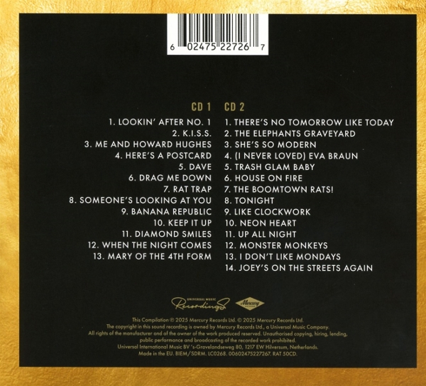 "THE BOOMTOWN RATS - THE FIRST 50 YEARS: SONGS OF B" ist eine umfassende CD-Sammlung zum fünfzigjährigen Jubiläum der einflussreichen irischen Rockband The Boomtown Rats. Diese Anthologie vereint einige ihrer bekanntesten Songs und zeigt die Entwicklung der Band von ihren punkinspirierten Anfängen bis hin zu ausgefeilten Pop-Rock-Hymnen auf. Mit Hits wie "I Don't Like Mondays" wurden The Boomtown Rats unter Frontmann Bob Geldof weltberühmt; sein Charisma und seine Songwriting-Qualitäten verhalfen der Band Ende der 1970er und Anfang der 1980er Jahre zu internationalem Ruhm. Ihre Musik griff oft gesellschaftliche Themen mit Scharfsinn und Dringlichkeit auf ? dafür erhielten sie viel Kritikerlob sowie Chart-Erfolge in ganz Europa. Herausgegeben wird diese CD vom renommierten Label Mercury, das für seine lange Tradition bei der Förderung wegweisender Künstler verschiedenster Genres bekannt ist ? ein Muss für Fans wie Neueinsteiger gleichermaßen.